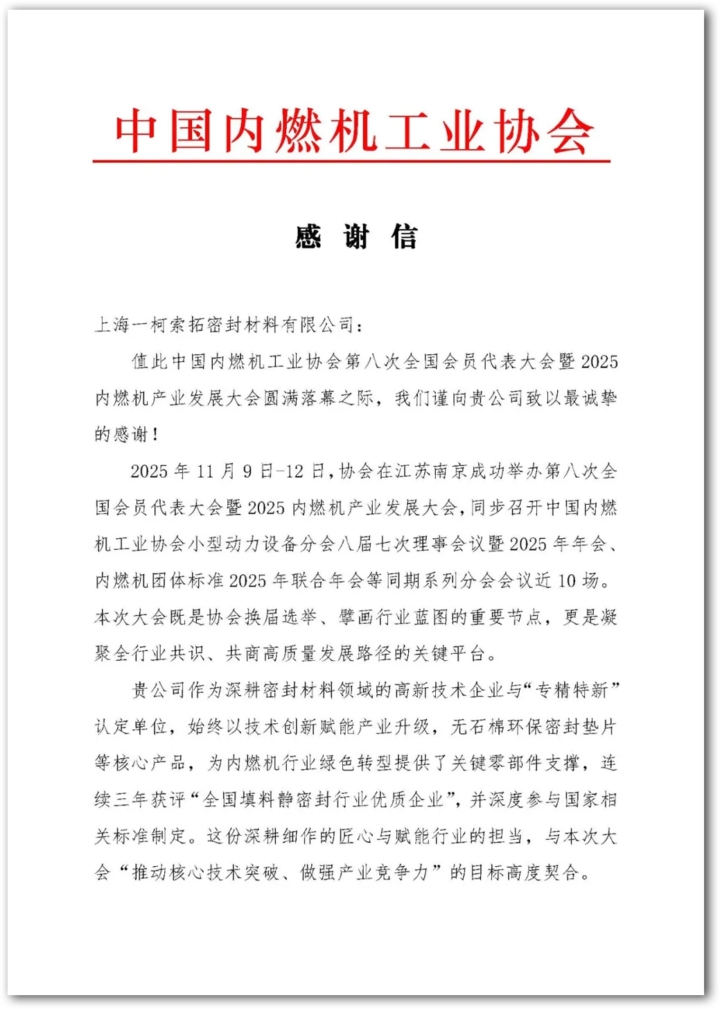來自中國內(nèi)燃機工業(yè)協(xié)會的感謝信 近日,我司收到來自中國內(nèi)燃機工業(yè)協(xié)會的感謝信,也借此機會感謝協(xié)會的多年信任和支持,作為會員我們一直全力盡責盡職并很榮幸作為其中一員推動協(xié)會和行業(yè)的發(fā)展。并再次祝賀大會的成功召開。 上一個 返回列表 下一個