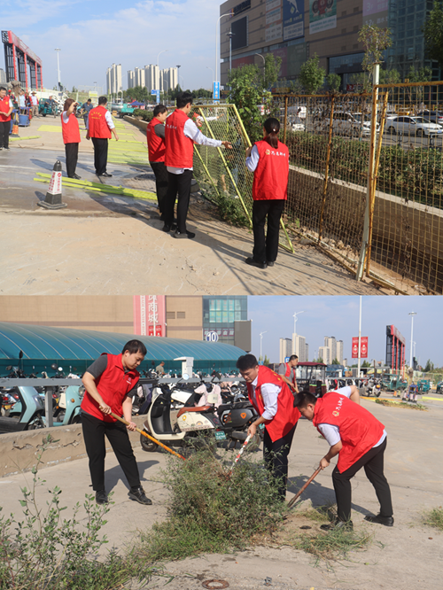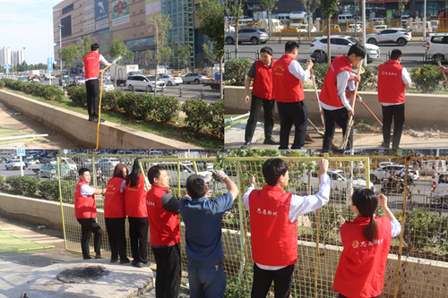9月24日,新商城運營公司黨支部組織開展“環境衛生整治”主題黨日活動,弘揚“奉獻、友愛、互助、進步”的志愿精神。活動中,黨員志愿者身著紅馬甲,協作拆除商城外圍陳舊圍擋,清理地面雜草垃圾,并拿起水管,給周邊綠化帶中的植物澆水,草叢在灌溉下愈顯生機。